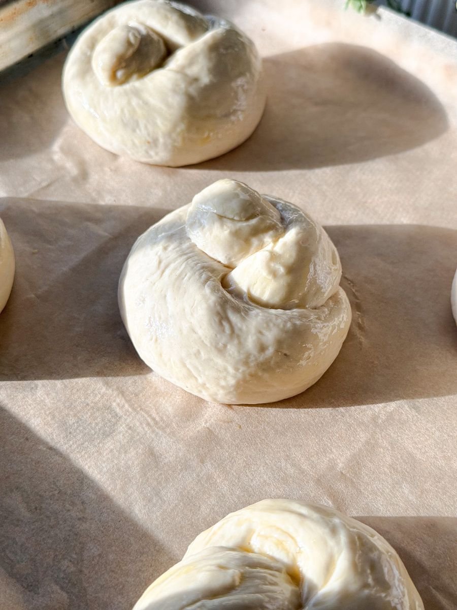 - Shape Dough – preheat oven to 350F. Lined a large baking sheet with parchment paper. Set aside. Deflate the dough and cut into 6 equal pieces. Working with one piece of dough at a time, roll into log shape, about 10 inches long, and shape into a knot. Transfer to baking sheet and repeat with remaining pieces of dough. Lightly cover shaped knots with plastic wrap and set aside for a second rise, about 15-20 minutes.